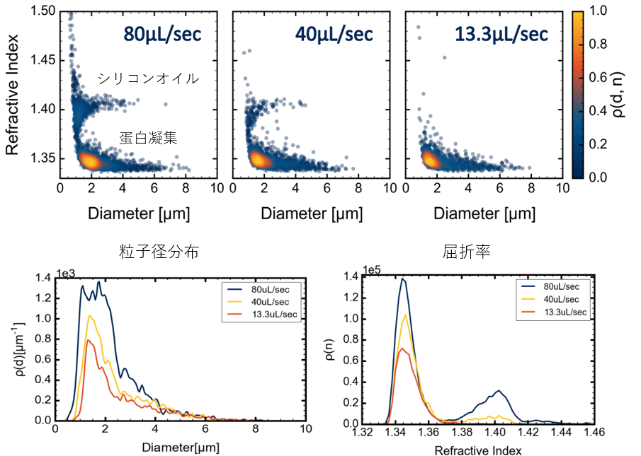 粒子径の近い蛋白質凝集体とシリコンオイルを確実に識別し、粒子径、濃度を求めています。