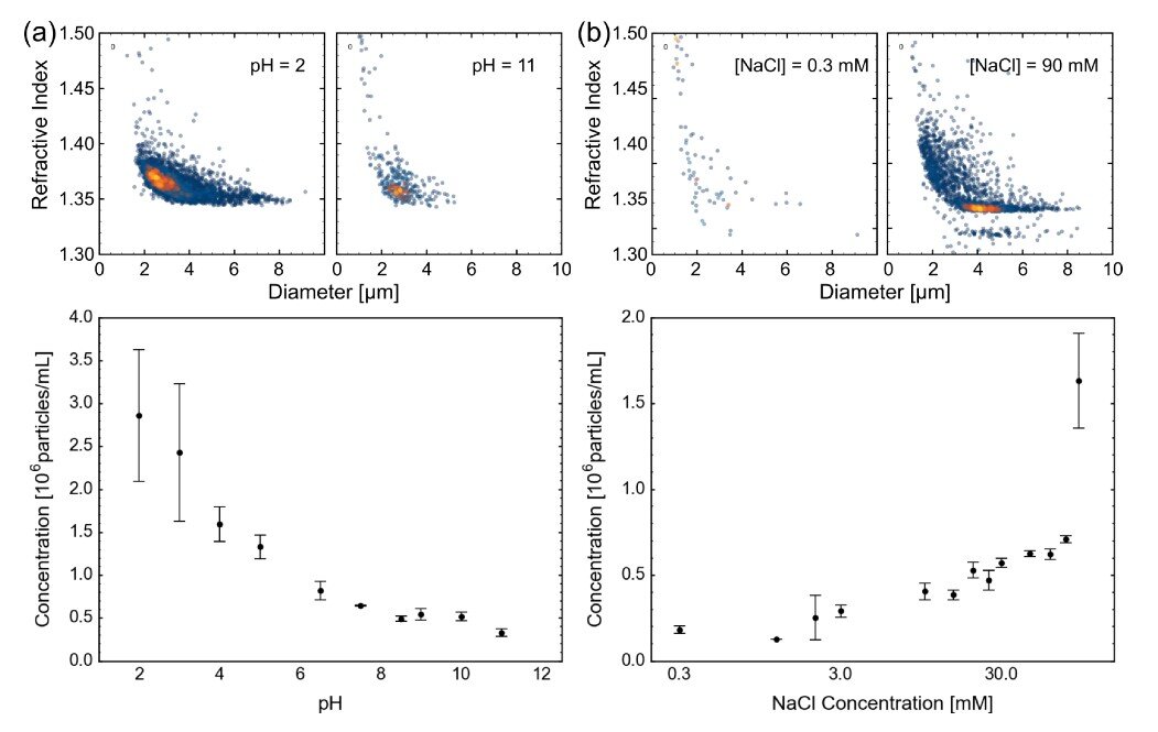 CMPスラリーの凝集傾向は、pHやイオン強度などの溶液環境特性に依存します。 以下の図は、xSightを用いて、さまざまな条件下でCMPスラリーの凝集を測定した結果を示しています。 パネル(a)では、pH2~11に振った際の凝集体の濃度を測定しました。パネル(b)では、塩濃度を0.3〜90 mMに変更することにより、イオン強度を変化させました。 スラリーの凝集挙動を環境パラメータの関数として理解することは、CMPスラリー配合を設計する際に重要です。 xSightは、シリカ、セリア、アルミナ、ダイヤモンドなど、さまざまなCMPスラリー材料の結果を提供します。