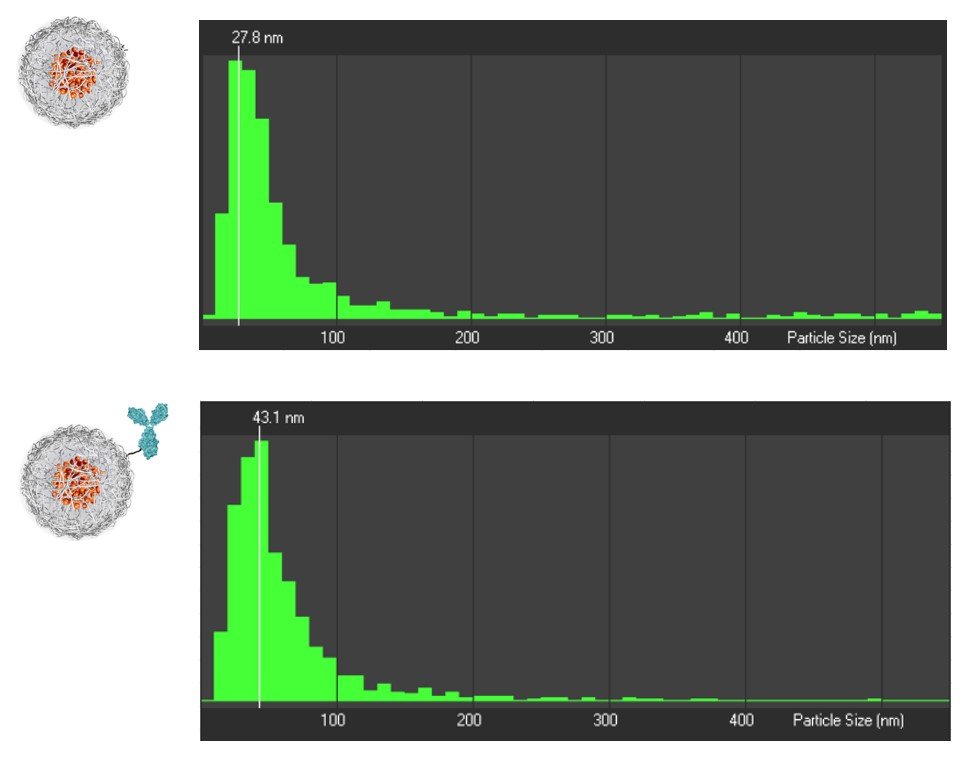 を用いて、30nmのDDSナノ粒子と、それに抗体を結合させた粒子を測定した例を示します。 ナノ粒子の粒子径最頻値は27.8nmであるのに対し、抗体を結合したナノ粒子の最頻値は、43.1nmを示しました。