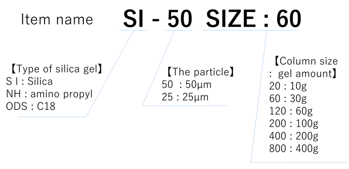 The first two letters mean the kind of silica gel. SI is unmodified silica gel, NH is silica gel modified with amine and ODS is silica gel modified C18.The next number means particle size and the unit is μm.The number of SIZE means column size. “20” means 10g of gel.Please refer to the specification for the details of column size.