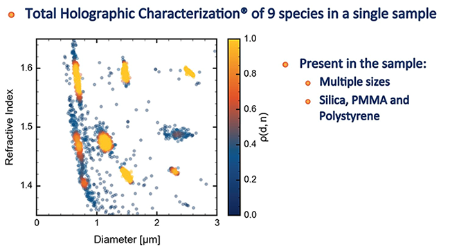 この革新的な技術は、精密で信頼性の高い多くの情報を得ることで、複雑な試料中の懸濁粒子の正確な定量測定を実現させます。下図に、9種類の粒子を含む試料の測定例を示します。 この結果は、Total Holographic Characterization技術が、異なる組成と粒子径の分布を同時に測定する能力があることを示しています。