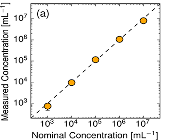 下図は、標準試料における103〜107粒子個数/ mLの測定濃度と公称濃度を比較した図で、双方が一致していることを示しています。